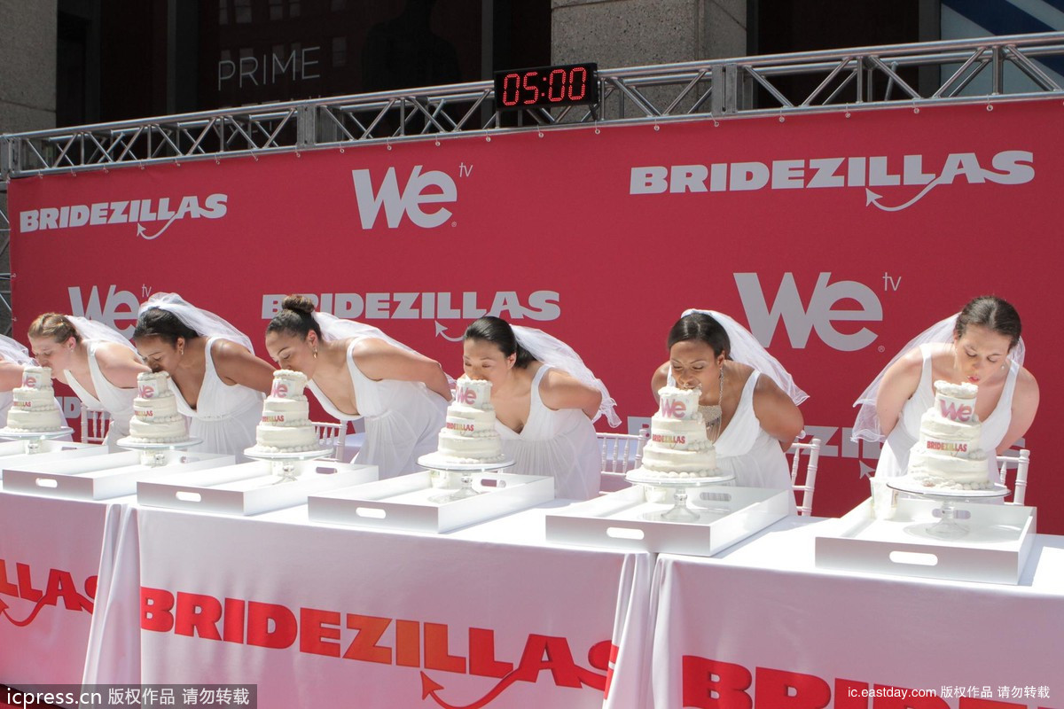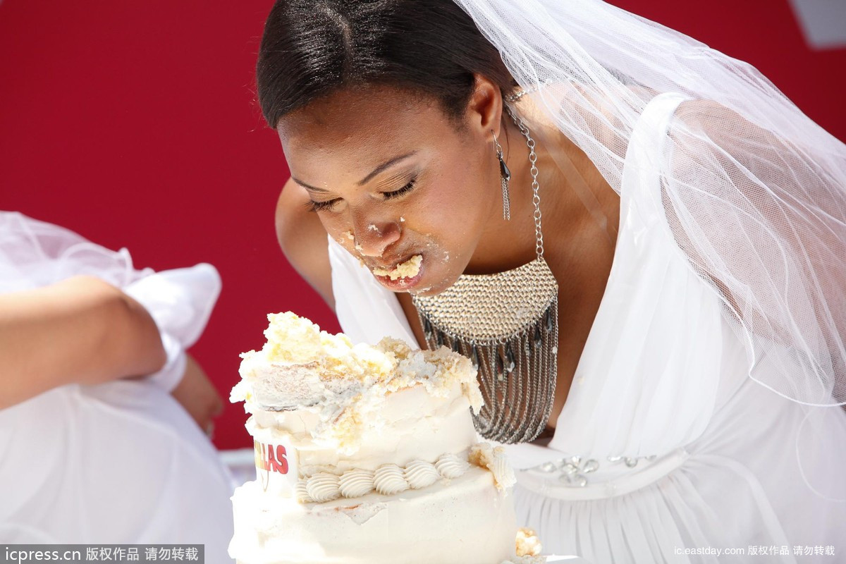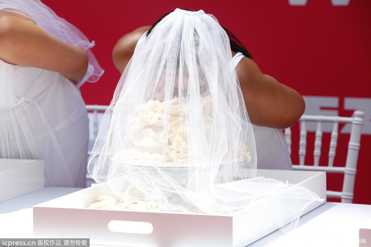 | 当地时间2013年5月30日,美国纽约,吃蛋糕大赛举行,参赛选手均为身着婚纱的女性,比赛规则之一是不能用手,各位参赛者大快朵颐完全不顾淑女形象。(来源:东方IC
