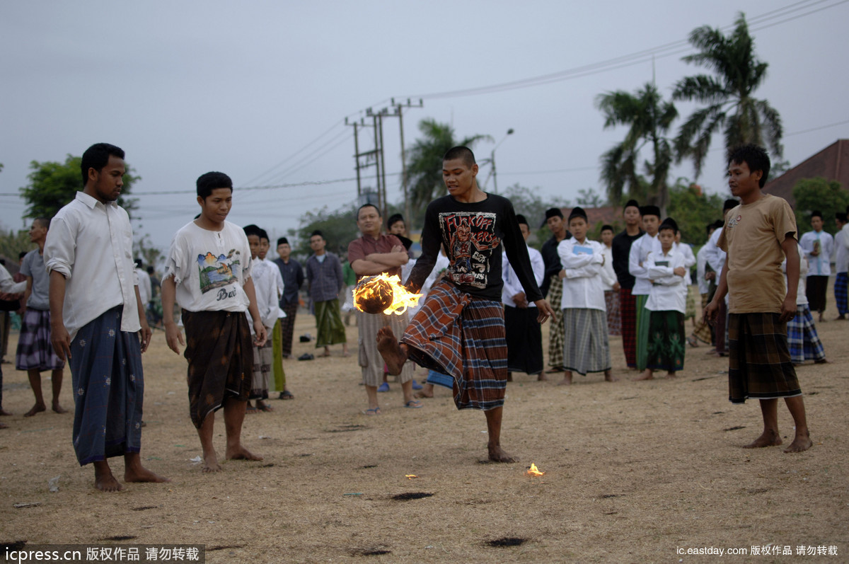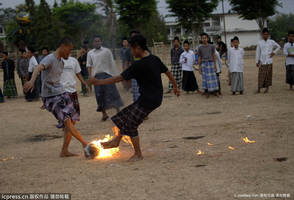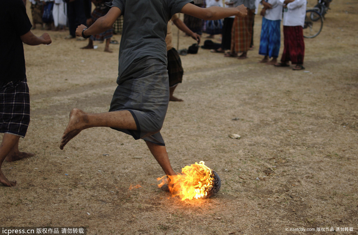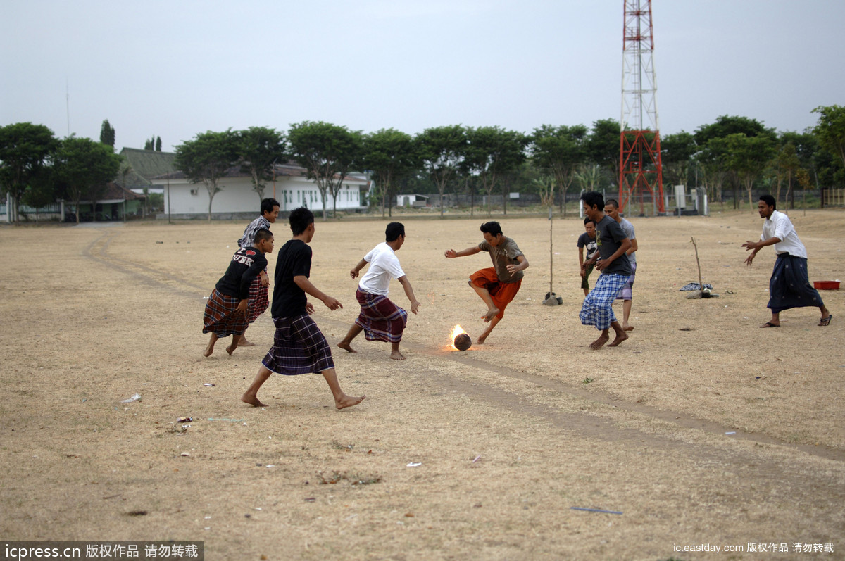 | 在印尼东爪哇的一些寄宿制学校里,一项名为“火球”的运动格外流行。比赛规则与五人制足球相似,不过参加的学生需要赤脚踢炙热的火球60分钟。制成“火球”的原材料是椰子,在煤油中浸泡2天后点火即可使用。据悉,“火球”运动是为了考验学生的胆量和忍耐力。(来源:东方IC未经许可不得转载