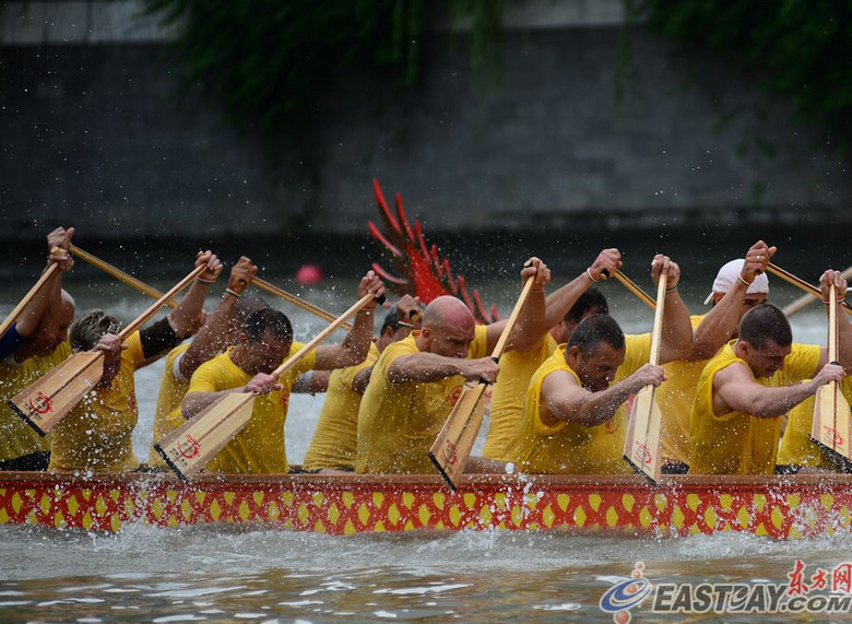 | 6月10日下午,2013年中国龙舟公开赛(上海·普陀站)暨第十届上海苏州河城市龙舟国际邀请赛开幕式在苏州河中远两湾城·梦清园水域举行,观赛现场人声鼎沸,热闹非凡。由于今年苏州河龙舟赛首次“升级”成为国际顶级龙舟赛事,因此所邀请的境外和外省市参赛队的规模和参赛水平也都高于历届,现场共计42支参赛队,共计900余名龙舟队员。图为外国选手们劈波斩浪。(来源:东方网