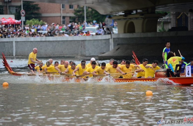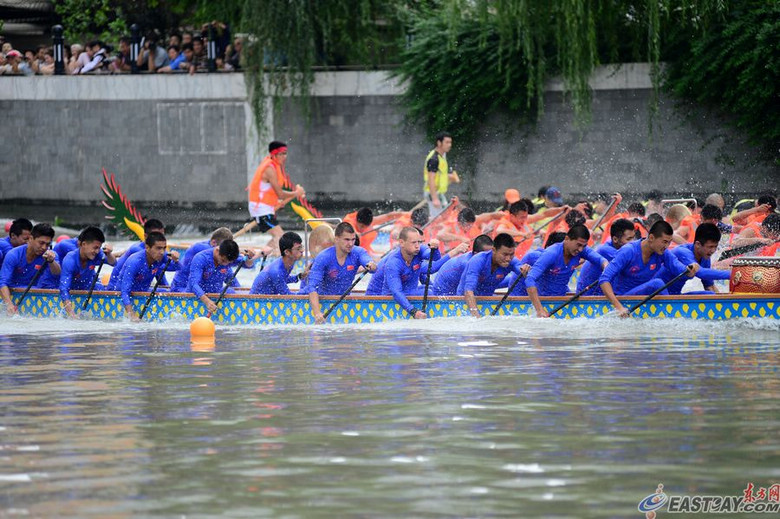 | 6月10日下午,2013年中国龙舟公开赛(上海·普陀站)暨第十届上海苏州河城市龙舟国际邀请赛开幕式在苏州河中远两湾城·梦清园水域举行,观赛现场人声鼎沸,热闹非凡。由于今年苏州河龙舟赛首次“升级”成为国际顶级龙舟赛事,因此所邀请的境外和外省市参赛队的规模和参赛水平也都高于历届,现场共计42支参赛队,共计900余名龙舟队员。图为中外联队展现了惊人的实力。(来源:东方网