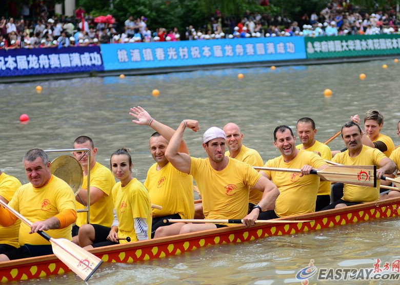 | 6月10日下午,2013年中国龙舟公开赛(上海·普陀站)暨第十届上海苏州河城市龙舟国际邀请赛开幕式在苏州河中远两湾城·梦清园水域举行,观赛现场人声鼎沸,热闹非凡。由于今年苏州河龙舟赛首次“升级”成为国际顶级龙舟赛事,因此所邀请的境外和外省市参赛队的规模和参赛水平也都高于历届,现场共计42支参赛队,共计900余名龙舟队员。图为秀出我的肌肉,外国朋友们的热情博得在场观众的连连叫好。(来源:东方网