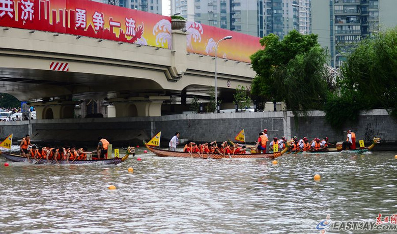 | 6月10日下午,2013年中国龙舟公开赛(上海·普陀站)暨第十届上海苏州河城市龙舟国际邀请赛开幕式在苏州河中远两湾城·梦清园水域举行,观赛现场人声鼎沸,热闹非凡。由于今年苏州河龙舟赛首次“升级”成为国际顶级龙舟赛事,因此所邀请的境外和外省市参赛队的规模和参赛水平也都高于历届,现场共计42支参赛队,共计900余名龙舟队员。(来源:东方网