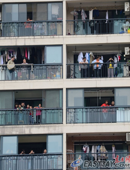 | 6月10日下午,2013年中国龙舟公开赛(上海·普陀站)暨第十届上海苏州河城市龙舟国际邀请赛开幕式在苏州河中远两湾城·梦清园水域举行,观赛现场人声鼎沸,热闹非凡。由于今年苏州河龙舟赛首次“升级”成为国际顶级龙舟赛事,因此所邀请的境外和外省市参赛队的规模和参赛水平也都高于历届,现场共计42支参赛队,共计900余名龙舟队员。图为居住在河边的市民们纷纷走上阳台观看龙舟赛。(来源:东方网