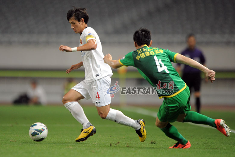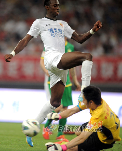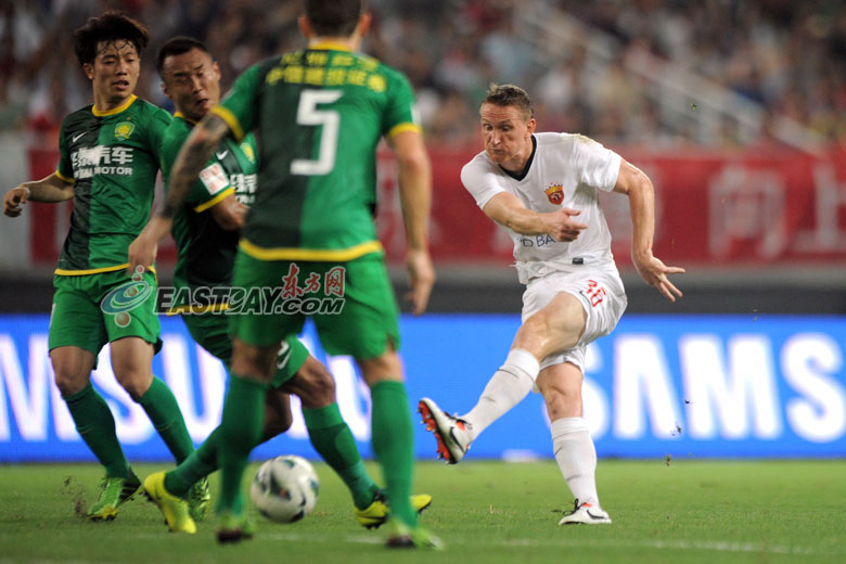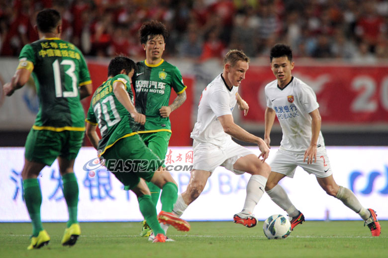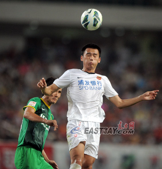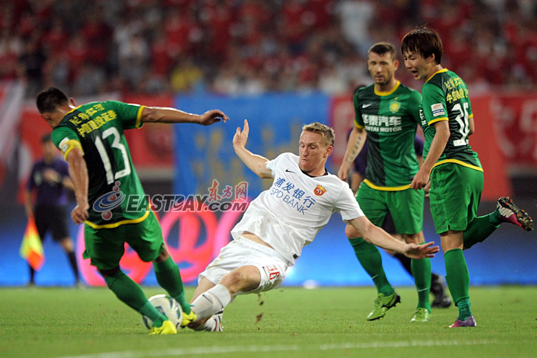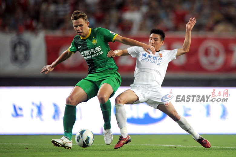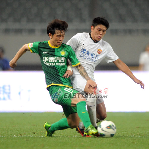 | 7月7日晚,2013中超联赛第十六轮,上海体育场,上海上港VS北京国安。上半场第9分钟,邵佳一远射为国安队首开纪录,第13分钟国安队中卫朗征拉拽朱峥嵘吃到红牌被罚出场。第57分钟,张稀哲左路抢下皮球后传中,格隆门前推射得分。第75分钟,国安队快攻到前场,王皓接格隆传球怒射得分,最终上海上港主场0比3不敌国安。(来源:东方网