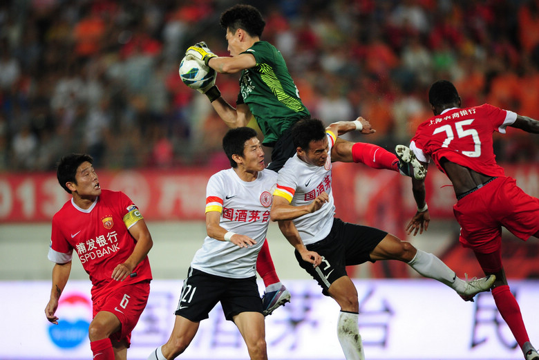 | 7月14日,上港上港队门将孙乐(上)在比赛中扑救。当日,在2013年中国足球超级联赛第17轮比赛中,贵州人和队主场以0比3不敌上海上港队。(来源:新华社)[!--empirenews.page--]