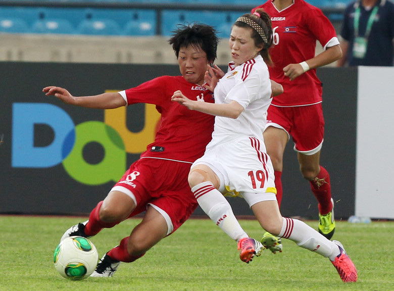 | 7月27日,中国女足队员周霏霏(前右)与朝鲜女足队员金恩珠拼抢。当日,在韩国首尔进行的2013年女足东亚杯比赛中,中国女足以0比1不敌朝鲜女足。(新华社发