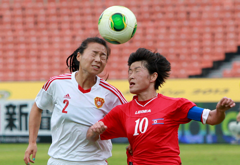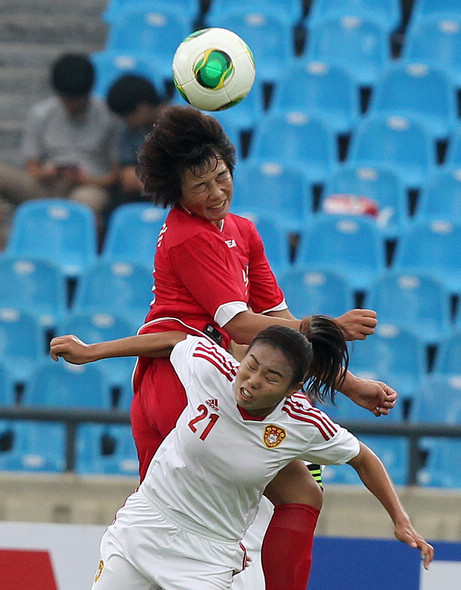 | 7月27日,中国女足队员王丽思(下)在比赛中争顶头球。当日,在韩国首尔进行的2013年女足东亚杯比赛中,中国女足以0比1不敌朝鲜女足。(新华社发