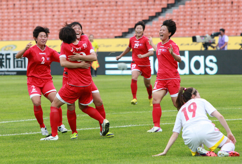| 7月27日,朝鲜女足队员庆祝进球。当日,在韩国首尔进行的2013年女足东亚杯比赛中,中国女足以0比1不敌朝鲜女足。(新华社发