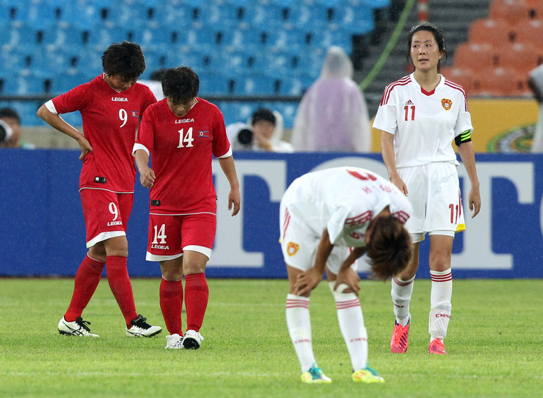 | 7月27日,中国女足队员浦玮(右一)在比赛后。当日,在韩国首尔进行的2013年女足东亚杯比赛中,中国女足以0比1不敌朝鲜女足。(新华社发