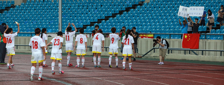 | 7月27日,中国女足队员赛后致谢现场球迷。当日,在韩国首尔进行的2013年女足东亚杯比赛中,中国女足以0比1不敌朝鲜女足。(新华社发 朴真熙摄)