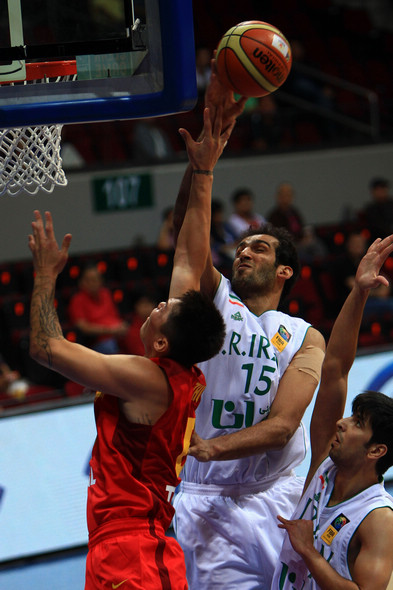 | 8月3日,中国队球员王治郅(右)在比赛中上篮。当日,在菲律宾进行的第27届男篮亚锦赛小组赛中,中国队以51比70不敌伊朗队。(来源:新华社)[!--empirenews.page--]