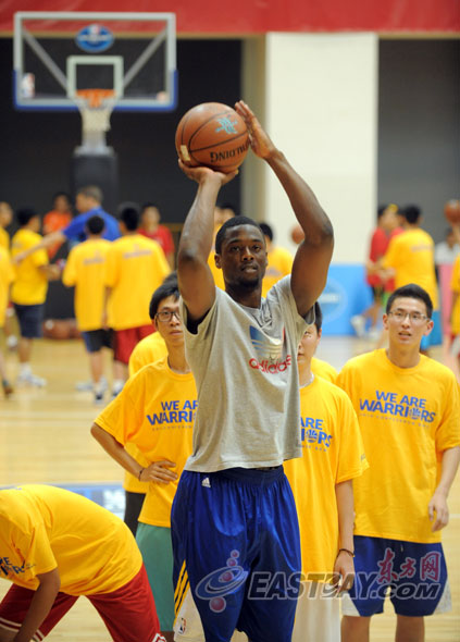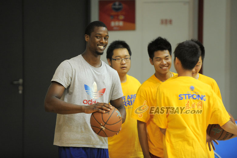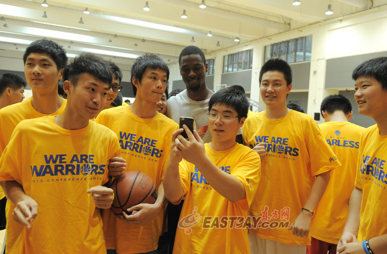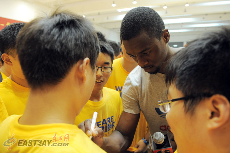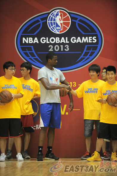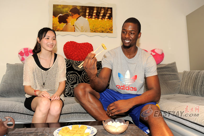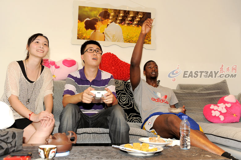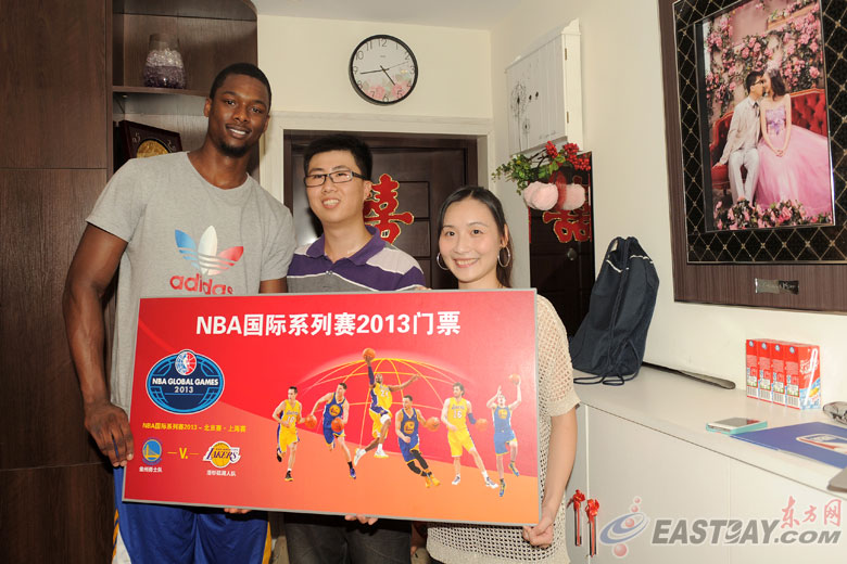 东方网8月6日消息:8月6日,NBA金州勇士队球员哈里森·巴恩斯来到上海一户幸运球迷王超一的家中,为其送上NBA国际系列赛2013门票。这位远道而来的客人在王家不仅品尝到了绿豆糕、烧卖、小笼包等中国传统美食,观看并把玩了一款热门NBA游戏,还向王超一的母亲束锦梅学习如何包上海小馄饨。此前,巴恩斯还在东方体育中心与参加NBA训练营的小球员们互动交流。(来源:东方网