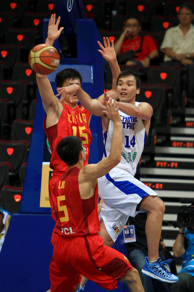 | 8月9日,中国队球员王哲林(上右)在比赛中防守。当日,在菲律宾举行的第27届男篮亚锦赛四分之一决赛中,中国队以78比96不敌中华台北队,无缘四强。(来源:新华社)[!--empirenews.page--]