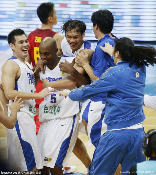 | 中华台北队庆祝胜利。8月9日,在菲律宾举行的第27届男篮亚锦赛四分之一决赛中,中国队以78比96不敌中华台北队,无缘四强。(来源:东方IC