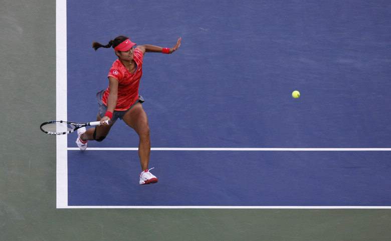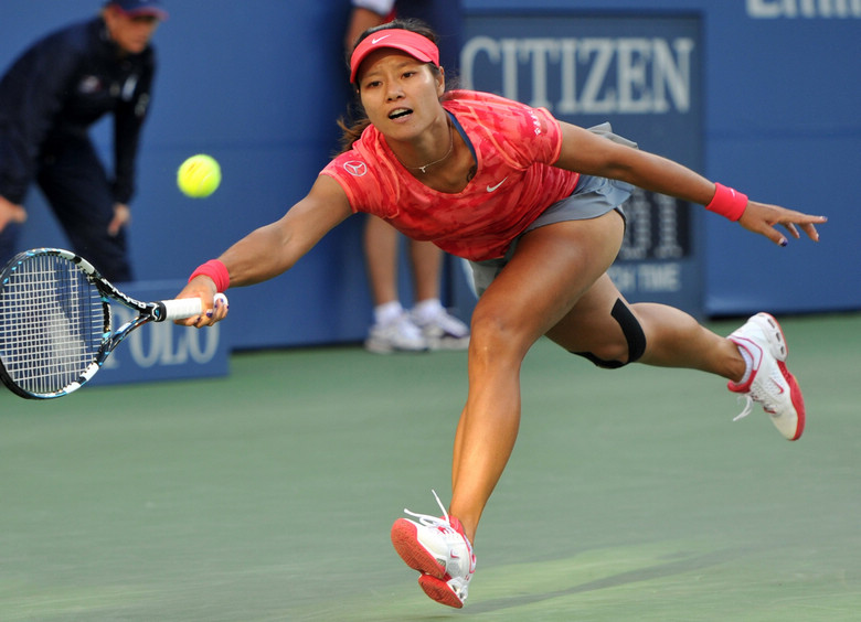 | 9月6日,李娜在比赛中。当日,在2013年美国网球公开赛女子单打半决赛中,中国选手李娜以0比2不敌美国选手小威廉姆斯,无缘决赛。(来源:新华社)