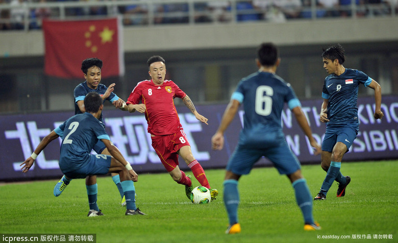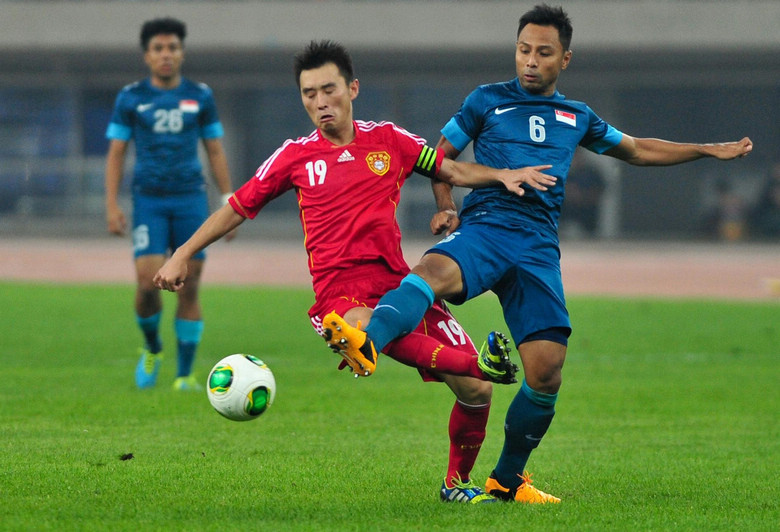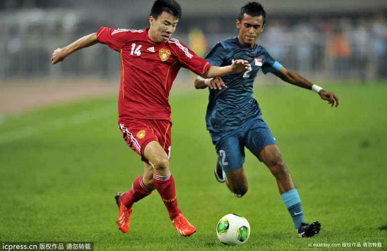 | 9月6日,中国队球员杨昊(中)与新加坡队球员拉曼在比赛中拼抢。当日,在天津市举行的国际足球友谊赛中,中国男子足球队以6比1战胜新加坡男子足球队。(来源:新华社)[!--empirenews.page--]