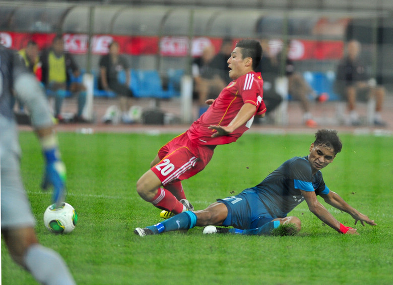 | 9月6日,中国队球员武磊(左)在比赛中被新加坡队球员巴哈卢丁铲倒,为中国队赢得点球机会。当日,在天津市举行的国际足球友谊赛中,中国男子足球队以6比1战胜新加坡男子足球队。(来源:新华社)[!--empirenews.page--]