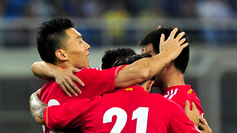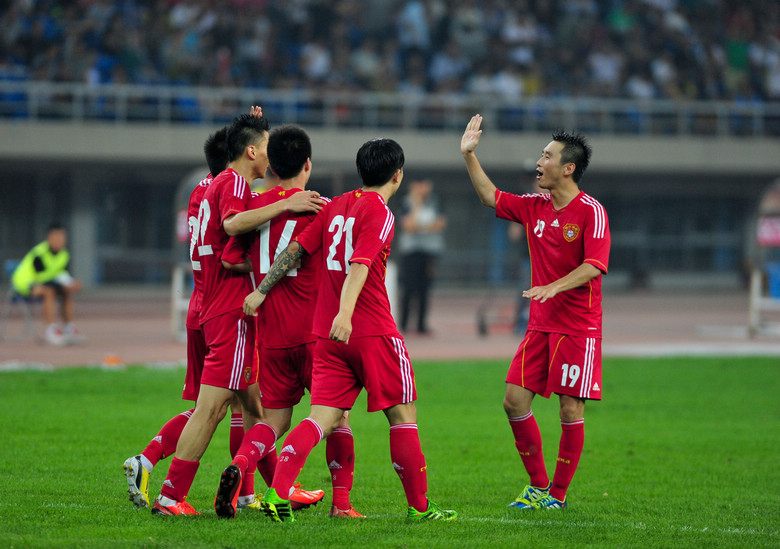 | 9月6日,中国队球员于大宝(左)在比赛中与队友庆祝进球。当日,在天津市举行的国际足球友谊赛中,中国男子足球队以6比1战胜新加坡男子足球队。(来源:新华社)