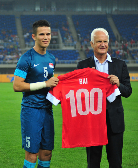 | 9月6日,新加坡队球员卡伊赞(左)接受其代表国家队出场100场的纪念球服。当日,在天津市举行的国际足球友谊赛中,中国男子足球队以6比1战胜新加坡男子足球队。(来源:新华社)[!--empirenews.page--]