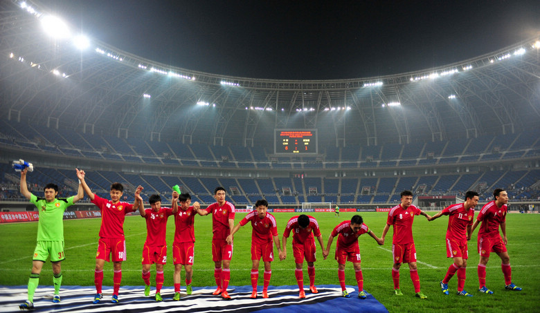 | 9月6日,中国队球员在比赛结束后向球迷表示感谢。当日,在天津市举行的国际足球友谊赛中,中国男子足球队以6比1战胜新加坡男子足球队。(来源:新华社)