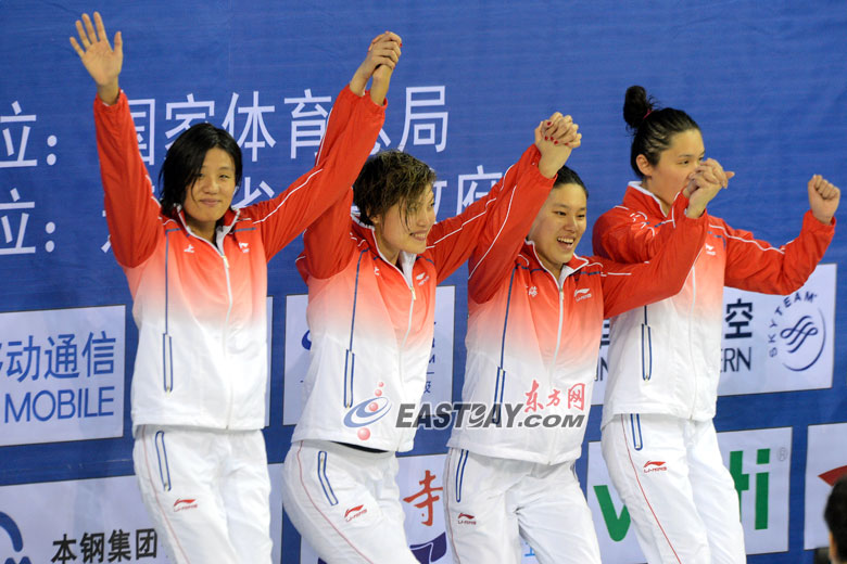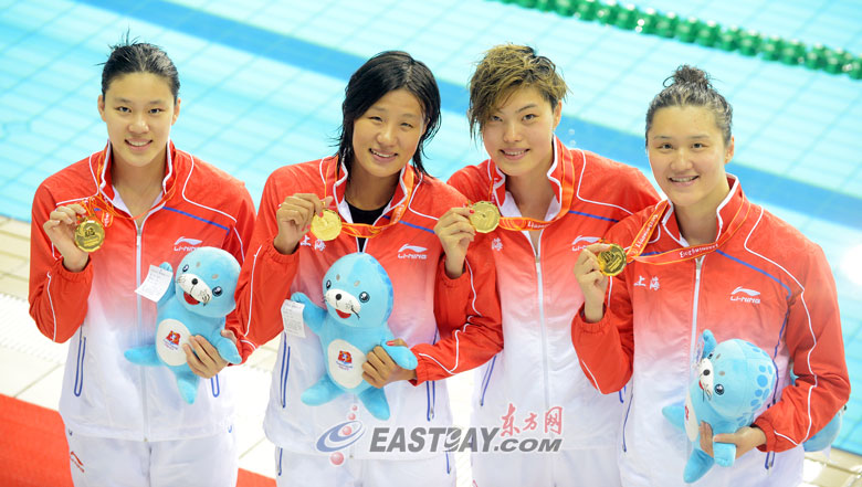 | 东方网9月8日消息:9月8日晚,2013年辽宁第十二届全运会游泳比赛在省体育局浑南训练基地游泳馆进入了第五个决赛日的争夺,在女子4x200米自由泳接力决赛中,唐奕率领上海队7分50秒50夺得冠军,叶诗文领衔的浙江队以7分51秒47收获银牌,山东队7分51秒91排名第三。(来源:东方网