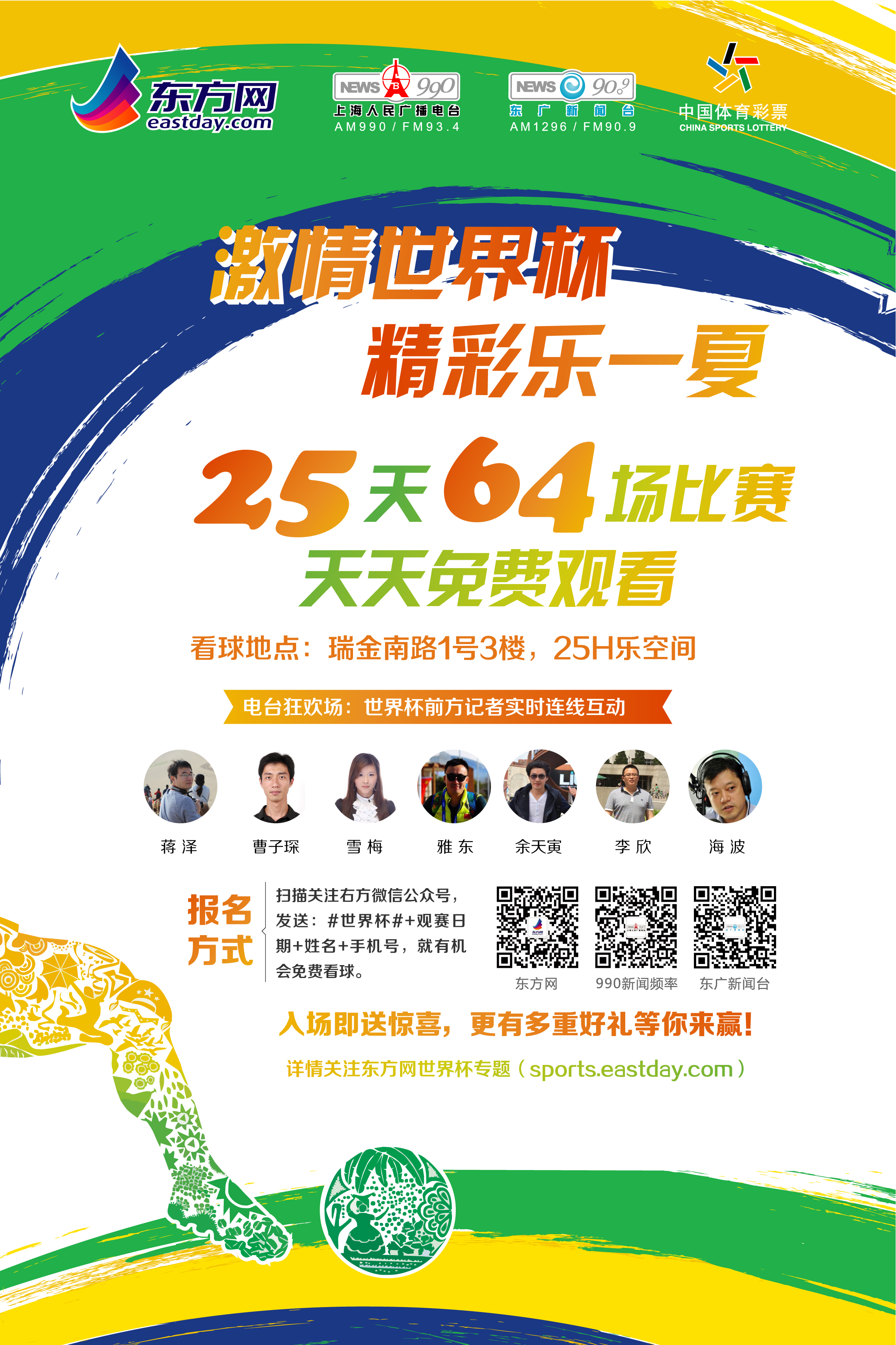 世界杯期间,东方网将携手上广990新闻频率、东广新闻台、上海体育彩票管理中心联合推出“天天免费看球”活动,为广大球迷提供一个交流互动的平台。即日起只需关注东方网微信公众号,发送报名信息:#世界杯#+观赛日期+姓名+手机号,即有机会免费看球,参与现场竞猜、互动游戏还可赢得多重神秘大礼。6月15日、7月14日【电台狂欢场】,知名主持人与您一同看球评球,巴西前方记者实时连线,让你体验绿茵赛场的火热碰撞。叫上朋友们一起来狂欢吧!一切尽在瑞金南路1号海兴广场3楼——25H乐空间。