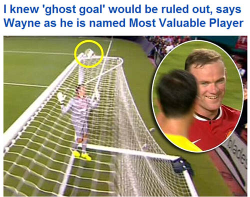 根据《每日邮报》报道,在国际冠军杯决赛中,鲁尼曾在下半场打入一记“幽灵球”,当时阿什利-科尔传中,球击中门梁后方的三角形支架又弹回场内,鲁尼推射空门得手,不过此球被当时裁判准确判罚无效,而鲁尼赛后也表示,其实他完全看清了当时的情形,自己很清楚裁判会发现球已经出界了。