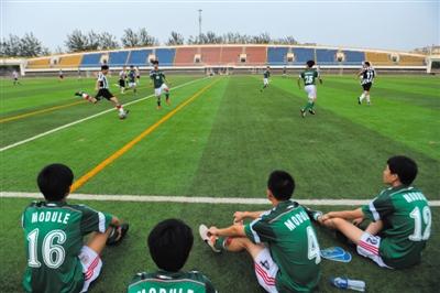 昨日,开发区体育中心足球场,一名踢球的男子和场地保安均称,昨日该场地收费。但根据公示,该体育中心足球场昨日8时至22时免费。新京报记者 吴江 摄