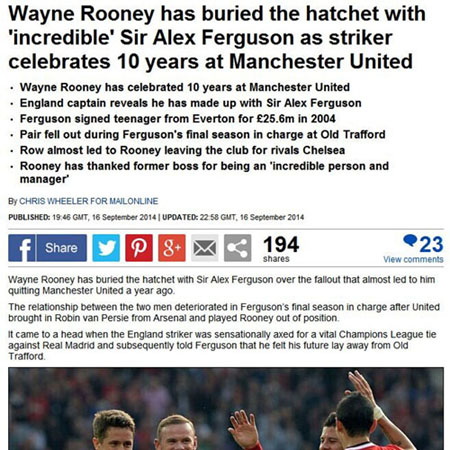 在弗格森执教曼联的最后一个赛季,弗格森同小胖发生了不快,这在很大程度上是因为范佩西的加盟让鲁尼让出了头牌地位,而在球队最后一个主场时,弗格森还当场宣布了鲁尼有意离队的消息,这让鲁尼感到了背叛,一度传言小胖将加盟英超死敌切尔西。不过1年过去了,两人却化干戈为玉帛,在接受曼联电视台采访时,小胖表示,“对我而言,弗格森是一位非常重要的人,我非常感谢他将我从埃弗顿带至曼联。我认为他是一个不可思议的人和教练,你能看得出来他对于比赛的渴望,他给了我和大家巨大的帮助。当年我刚刚来到球队时,他对我们年轻人帮助很大,非常感谢他。”