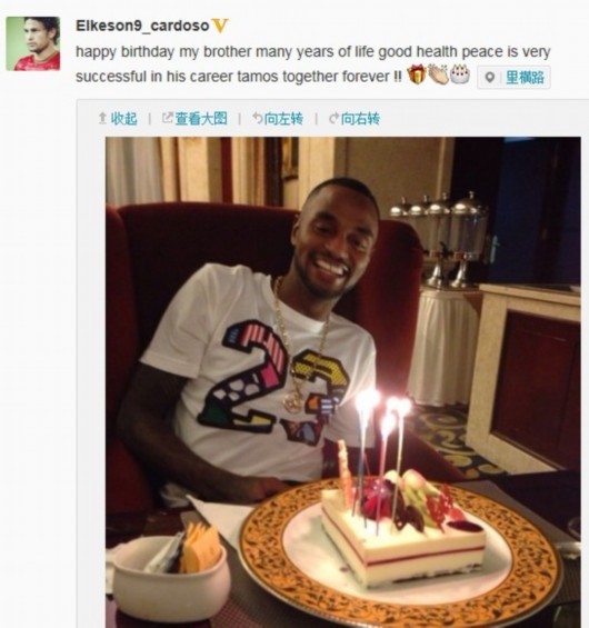 昨天是恒大球员雷内25岁的生日,好友埃尔克森微博晒出为好兄弟庆生的照片,并附言祝福兄弟生日快乐、健康、在职业生涯中取得成功,我们永远在一起!