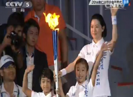 大长今携两位小朋友点燃圣火 用最简单方式完成