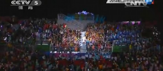 李亨泽跑到了距离主火炬塔最近的看台,最后将由谁来点燃主火炬呢?导演开始卖关子了,先是李亨泽开始和身边的观众互动,然后是场地中的歌手演唱,李亨泽又带领身边的观众挥舞双手。