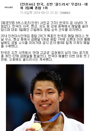 北京时间9月21日,2014年仁川亚运会次日比赛结束,韩国在头两日拿到12金10银9铜连续两日居奖牌榜首位。为此韩国媒体《Naver》表示,韩国在亚运初期展示了可怕的“淘金热”,实现对中国的压制。