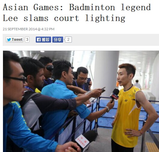 在赛后接受采访时,李宗伟在谈到本次亚运会的羽毛球场馆条件时非常不满意,他表示:“这是我在亚运会的第一场比赛,我就是尽力表现自己,做到最好,享受我最后一届亚运会。我认为羽毛球比赛的场馆状况非常糟糕,因为灯光不太合适。”