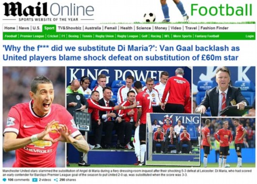 当莱斯特城将比分扳成3比3平时,范加尔做出了一个出人意料的决定,那就是将队中最具威胁的迪玛利亚换下,换上西班牙中场马塔,最终曼联再失两球,遭遇耻辱性翻盘。赛后,一位知情人对《每日邮报》透露说,球队更衣室内的氛围“非常紧张”,甚至有一名曼联球员爆粗口,说:“Why the f*** did we substitute Di Maria?(我们TM为什么换下迪玛利亚?)”