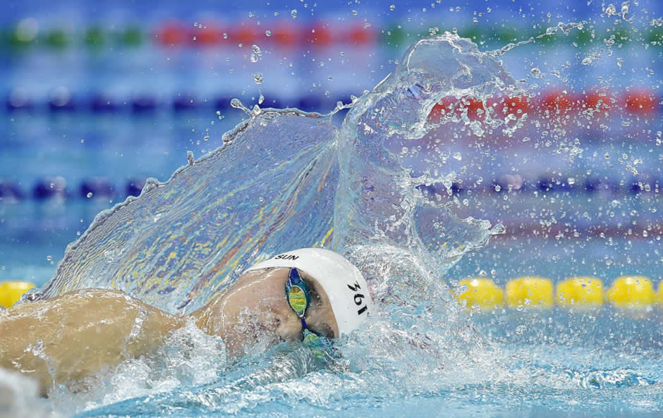 晚上进行的决赛,孙杨位居第四泳道,两大对手朴泰桓、萩野公介则位于他相邻的第三、第五泳道,另一名中国选手郝运位于第6泳道,另一名日本选手山本耕平则是位于第2泳道。发令枪响,孙杨在出发的时候稍稍落后,萩野公介则在前50米冲得相当迅速,不过在150米转身过后,孙杨就已经反超了对手,接下来的比赛,孙杨、萩野公介、朴泰桓三人并驾齐驱。