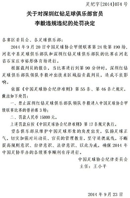 北京时间9月24日,中国足协公布了对中甲深圳红钻主帅李毅的处罚决定。他因为在红钻与中基的比赛中指责裁判,将被停赛3场及罚款15000元。