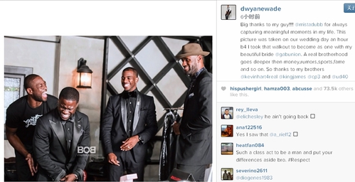 在instagram上,韦德写道:“向我的兄弟们致意感谢!@mistadubb总能捕捉到我人生中充满意义的一刻,这张照片拍摄于我婚礼举办前的一个小时。真正的兄弟情要远远超越金钱、流言、运动、名声等方面。我真的非常感谢自己的这些兄弟们。感谢@哈特@勒布朗@保罗@哈斯勒姆@波什(没有出现在这张照片中)出席婚礼,和我一起来分享这一时刻。#你们知道凯文会让我笑个不停##我们住在不同的城市,但当我们在一起时总是会感觉到爱#”