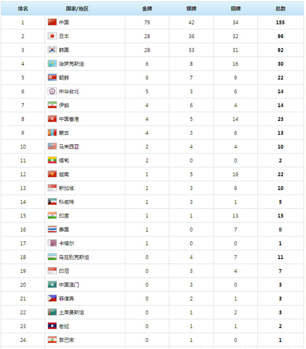 2014仁川亚运会金牌榜(截止9月26日8时)