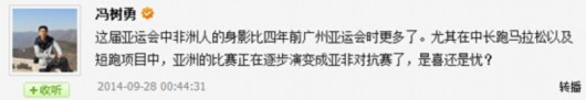 图片说明:冯树勇微博“亚洲比赛称亚非对抗赛,是喜还是忧?”