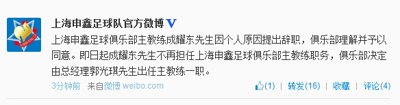 东方网9月29日消息:北京时间9月29日消息,上海申鑫足球俱乐部今天正式宣布:主教练成耀东先生因个人原因提出辞职,俱乐部理解并予以同意。即日起成耀东先生不再担任上海申鑫足球俱乐部主教练职务,俱乐部决定由总经理郭光琪先生出任主教练一职。