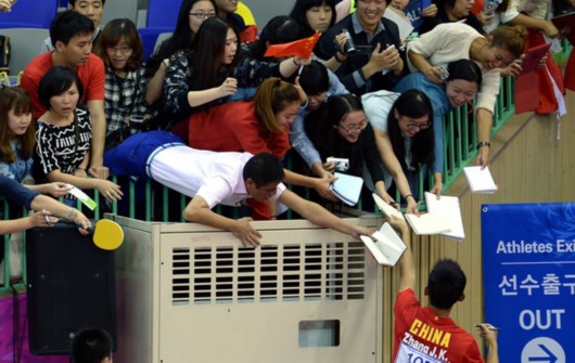 图片说明:球迷求张继科签名。