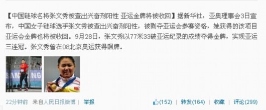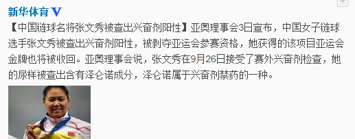 北京时间10月3日,亚奥理事会3日宣布,中国女子链球选手张文秀被查出兴奋剂阳性,被剥夺亚运会参赛资格,她获得的该项目亚运会金牌也将被收回。亚奥理事会说,张文秀在9月26日接受了赛外兴奋剂检查,她的尿样被查出含有泽仑诺成分,泽仑诺属于兴奋剂禁药的一种。