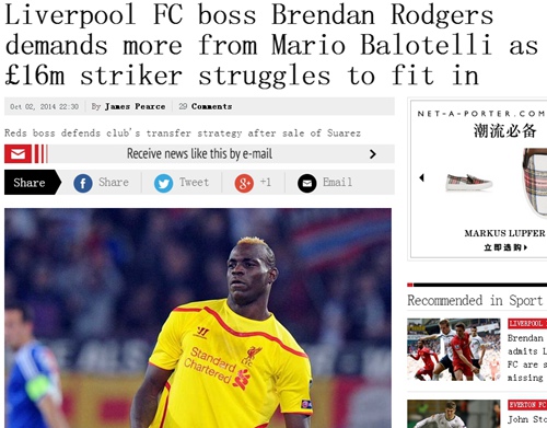 上赛季,在苏亚雷斯的率领下,利物浦大杀四方;新赛季,利物浦锋无力,进球相当难,作为苏神的接班人巴洛特利受到外界的质疑,赛前新闻发布会上,利物浦主帅罗杰斯表示,意大利前锋并不是苏亚雷斯的最佳替代者,只是追求其他前锋失败,巴洛特利才备胎转正。“当他加盟时,我就说过这是一个经过计算的冒险。我必须为之努力工作,设法让他能为球队表现良好。这个小伙子主观上一直在努力提高那些我们要求的方面,比赛强度、工作效率。而在进球方面,巴洛特利则需要进步,就是这么简单。”