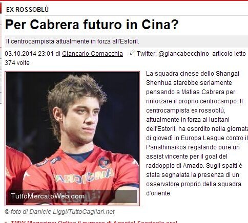 北京时间10月4日,意大利《全市场网》爆料,上海绿地看中了效力于葡超埃斯托里尔队的乌拉圭中场卡布雷拉,欲将他招入帐中。尽管2014赛季尚未结束,但绿地已经未雨绸缪为2015赛季做起了充足的准备。