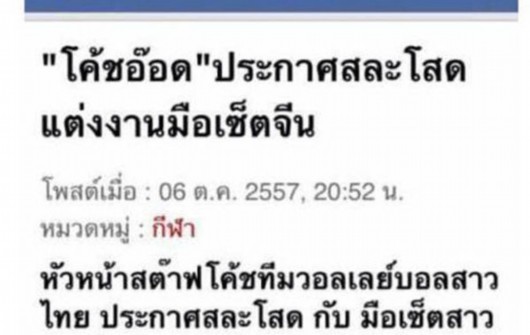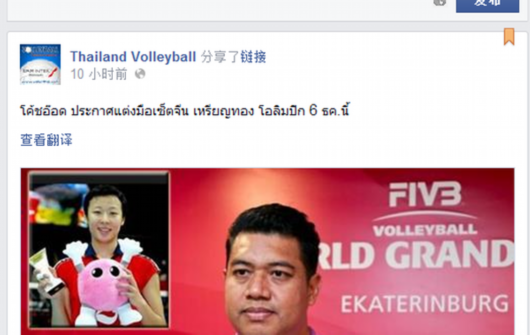 2014年10月7日消息,名为“Thailand Volleyball”(泰国排球网)的脸书账号爆料,前中国女排队长冯坤
