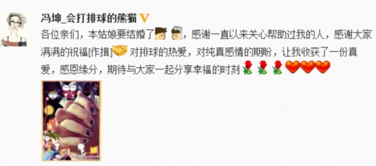 而冯坤今日在自己的微博中也确认了自己即将结婚的消息:“各位亲们,本姑娘要结婚了,感谢一直以来关心帮助过我的人,感谢大家满满的祝福。对排球的热爱,对纯真感情的期盼,让我收获了一份真爱,感恩缘分,期待与大家一起分享幸福的时刻。”