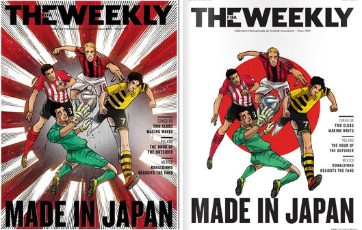 根据日本共同社的报道,在这期FIFA介绍日本球员旅欧的专刊中,封面是本田圭佑和香川等现阶段日本球员旅欧的代表人物,而背景则是周围有放射状延伸的红线,看起来与二战时期日本的军旗十分相似。