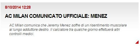 北京时间10月8日晚消息,意甲AC米兰[微博]俱乐部官方宣布队中法国前锋梅内大腿肌肉受伤,他将在未来几天接受进一步的检查,现在还不能确定具体的伤停时间。