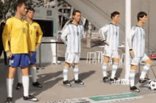 随着南美超级德比杯的临近,准备工作也在如火如荼地进行,在鸟巢外的某个检票口,我们发现这里摆放着5位球员的塑像。不过,若是抹去其球衣上的号码,着实让人难以分辨这些球员都是谁。